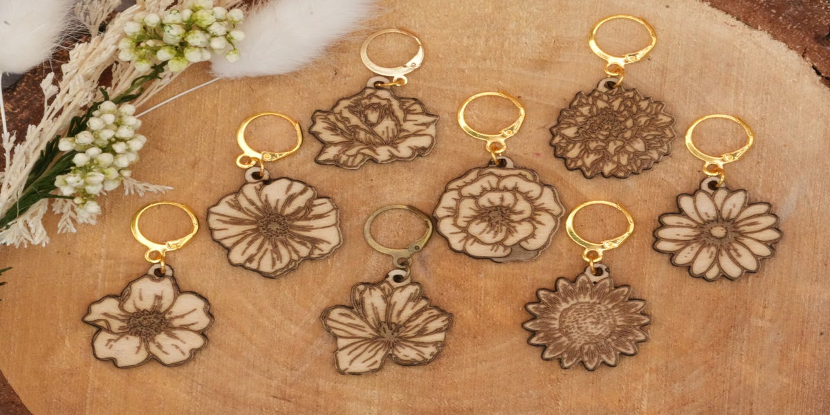 Ihr elegantes Blütenmotiv ziert diesen einzigartigen Maschenmarkierer, den es in zwei Varianten gibt: mit feiner Lasergravur oder kunstvoll handbemalt. Perfekt für stilbewusste Strickerinnen!