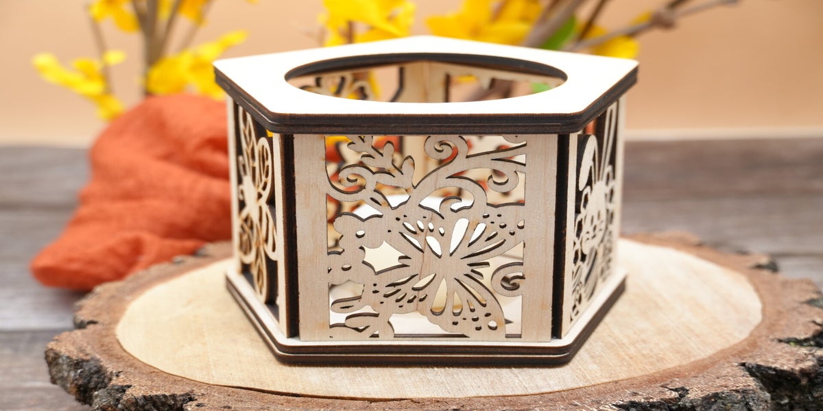 Diese edle, 5-eckige Holzlaterne ist ein echtes Highlight für deine Frühlings- und Osterdeko. Jedes der fünf Seitenteile zeigt ein anderes, liebevoll gelasertes Motiv – von Häschen über Vögel bis hin zu floralen Ornamenten.